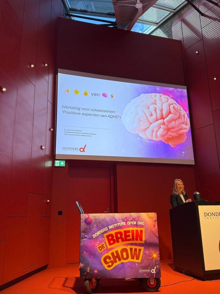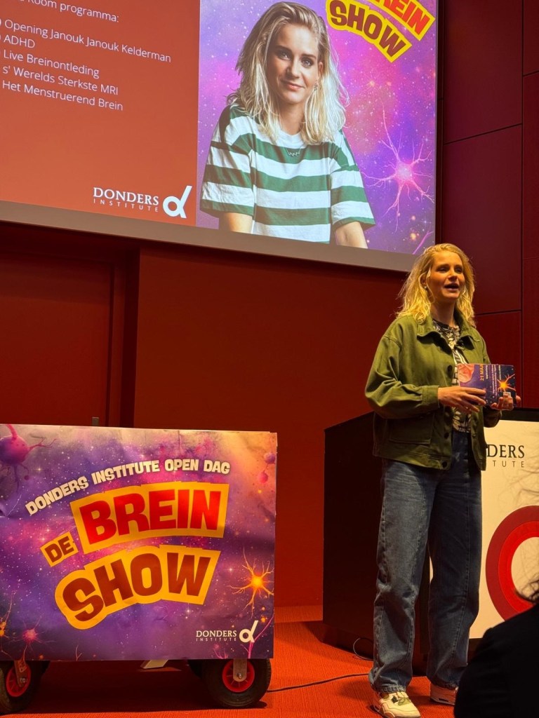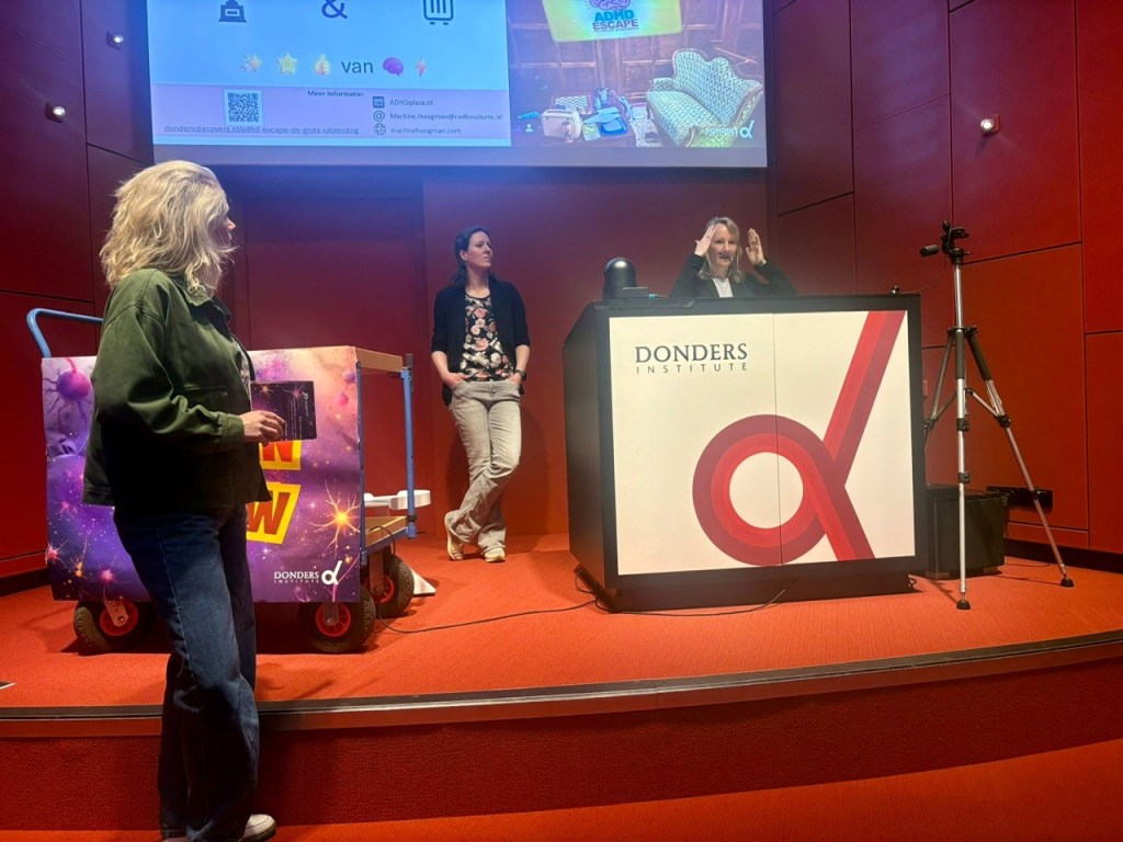 March 2026: on the 21st of March the Donders Institute opened their doors for the public. On this day many researchers displayed their work; there were lab tours, escape rooms (also ours), short talks, experiments and experiences. Martine gave a lecture about positive aspects of ADHD in the Red Room. The room was full and many questions were answered!